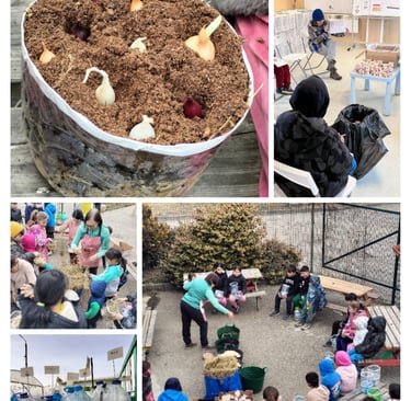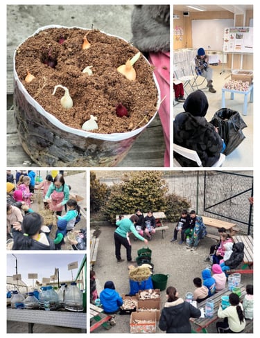 Împreună am creat câte o grădină de tip lasagna în bidoane de plastic, în care am plantat ceapă. Ne-am amintit și despre legumele timpurii și despre ce cultivăm primăvara.